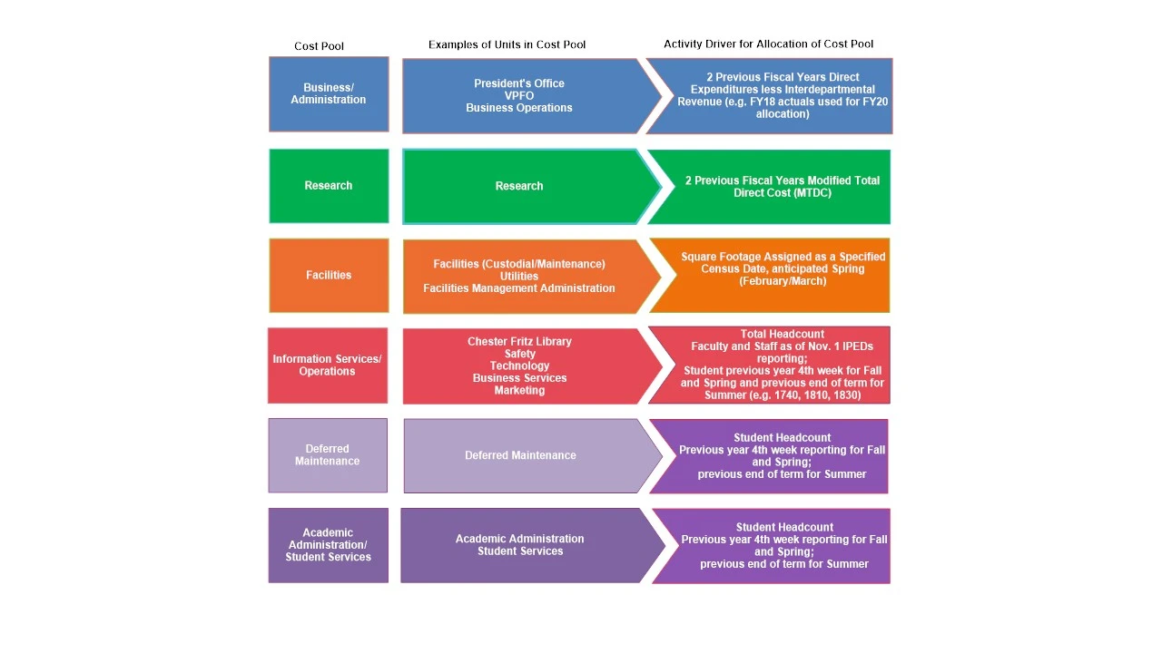 Incentive-based Budget Model brings stakeholders to the table to understand and consider areas important to UND’s success. All Service Units have been grouped into a manageable number based on an allocation method and if too large, administrative structure. These groups are called cost pools. UND has six cost pools. The best practice to allocate these costs to the Primary Units is a logical activity driver. In other words, a Primary Unit’s percentage of the total of the named activity. Below are the six cost pools with the activity driver listed in the parenthesis.